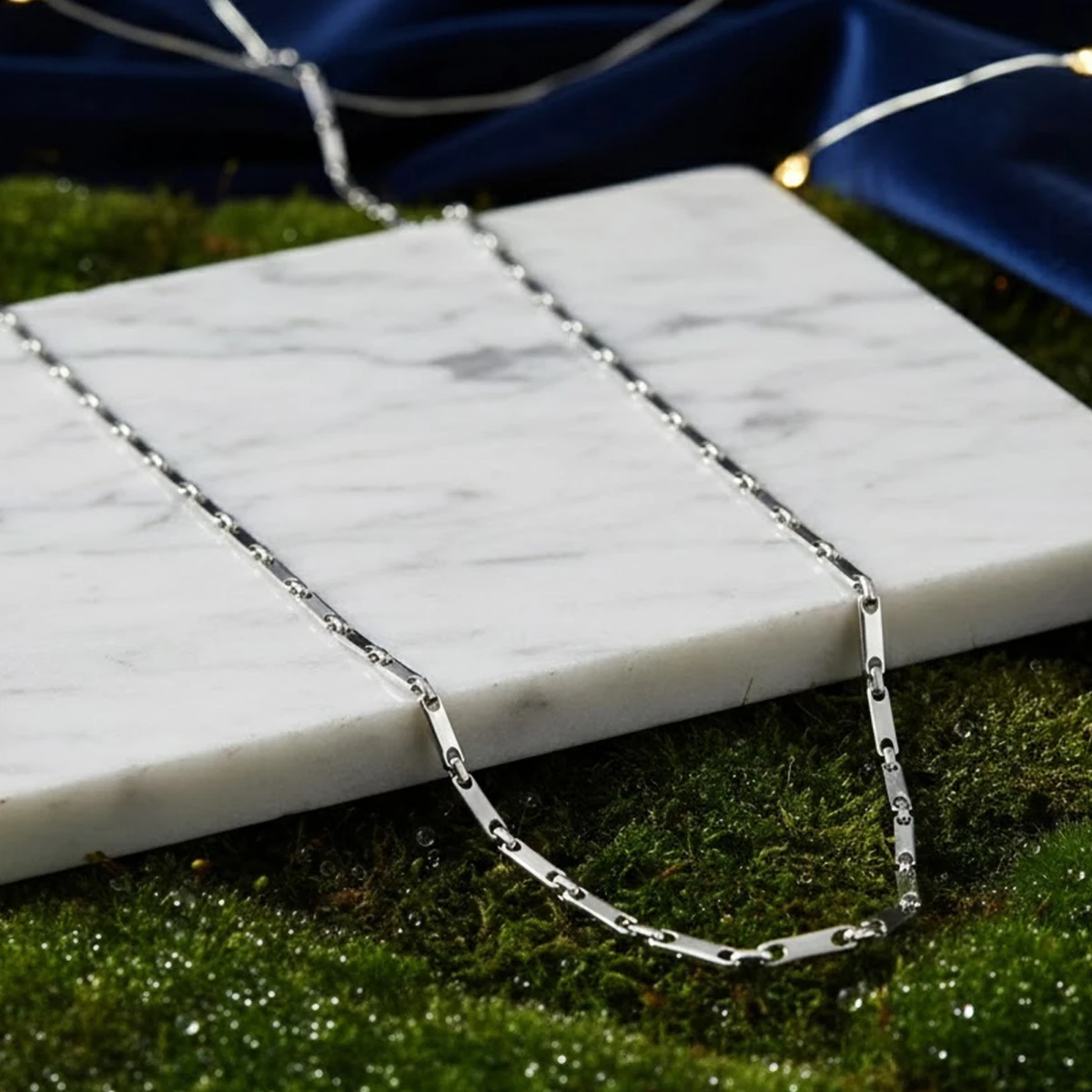 The Anurādhā chain showcases a refined silver design with alternating long and short rectangular links, creating a sleek, contemporary aesthetic. Its polished finish adds a touch of sophistication, making it perfect for both everyday wear and special occasions.