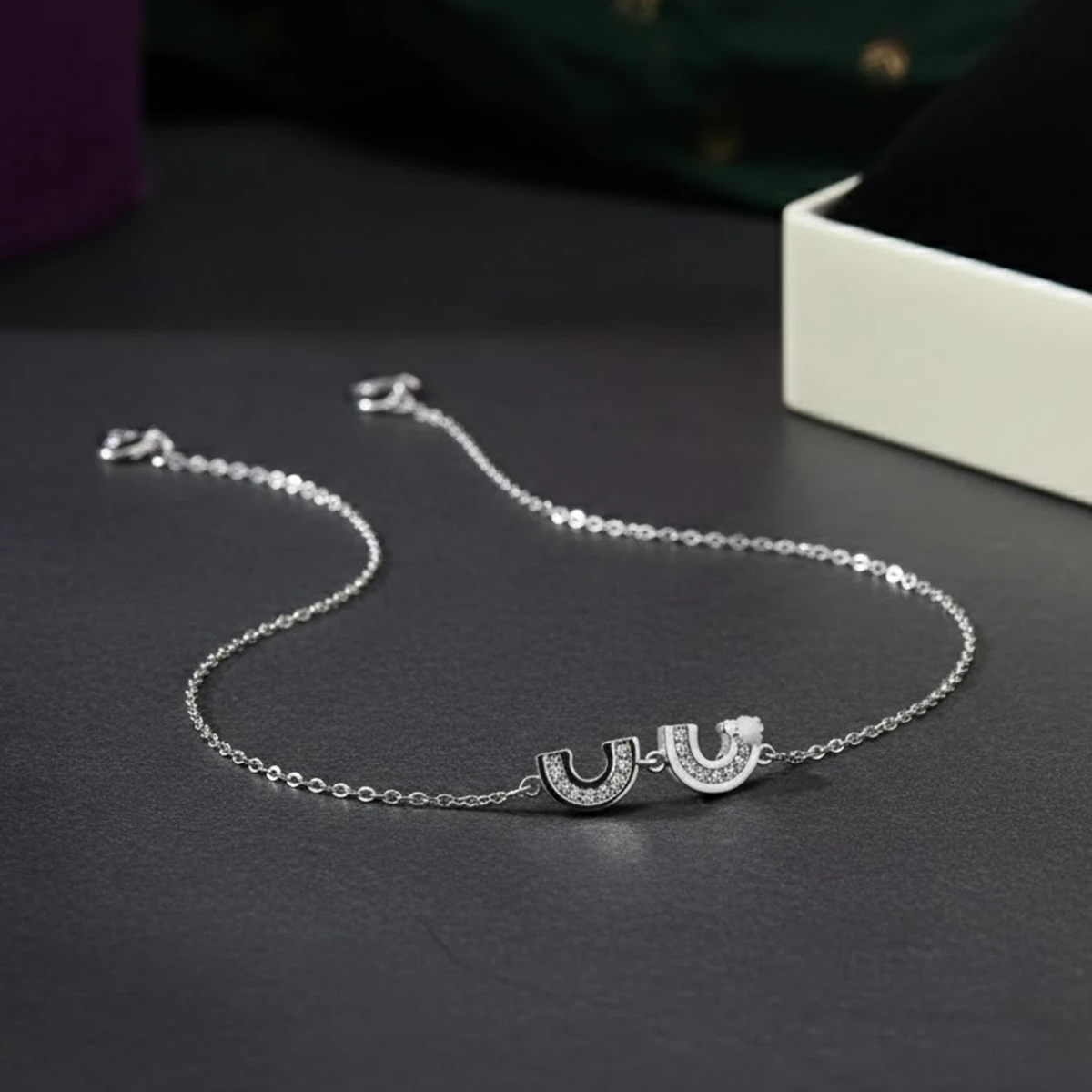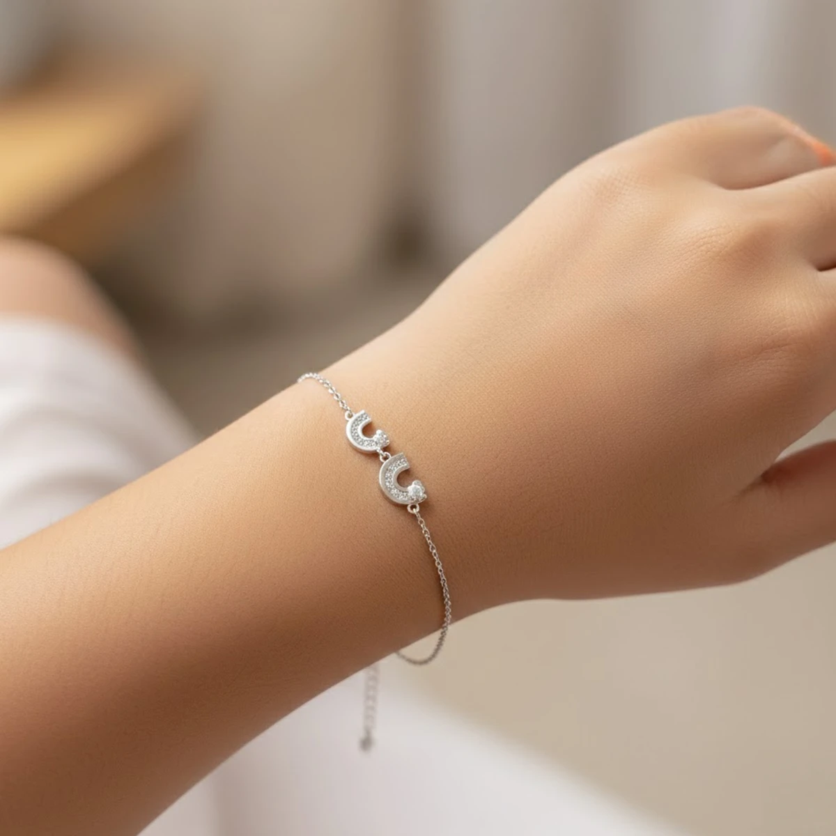 The Kiraṇavalaya bracelet radiates charm and elegance with its two interlocking rainbow motifs. Crafted in silver and embellished with sparkling cubic zirconia stones, it captures joy and sophistication in every detail. A delightful accessory that adds color and sparkle to any look.