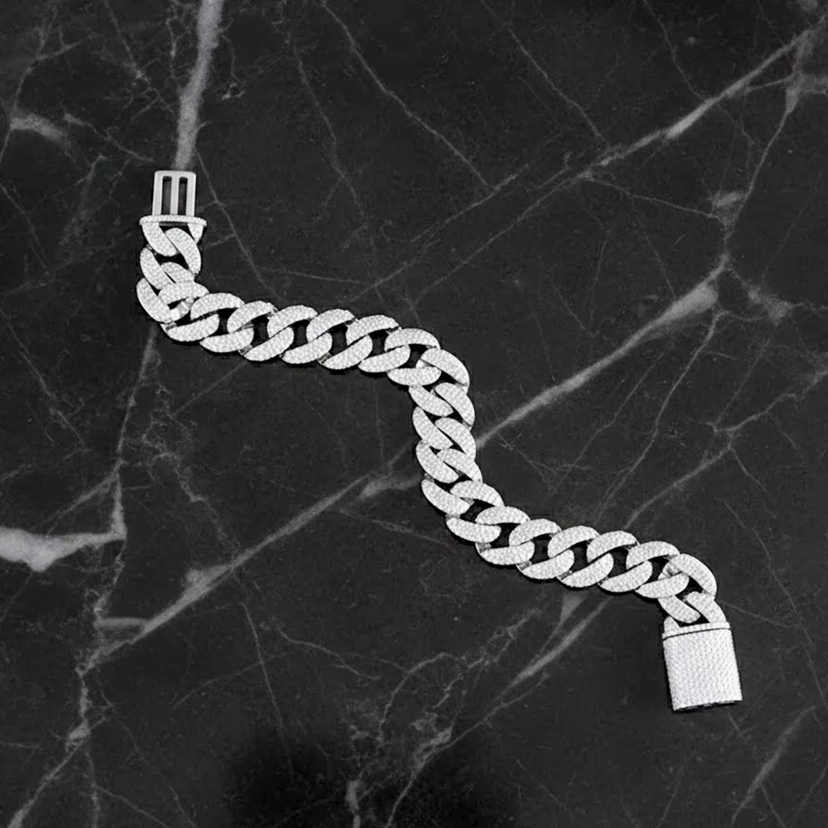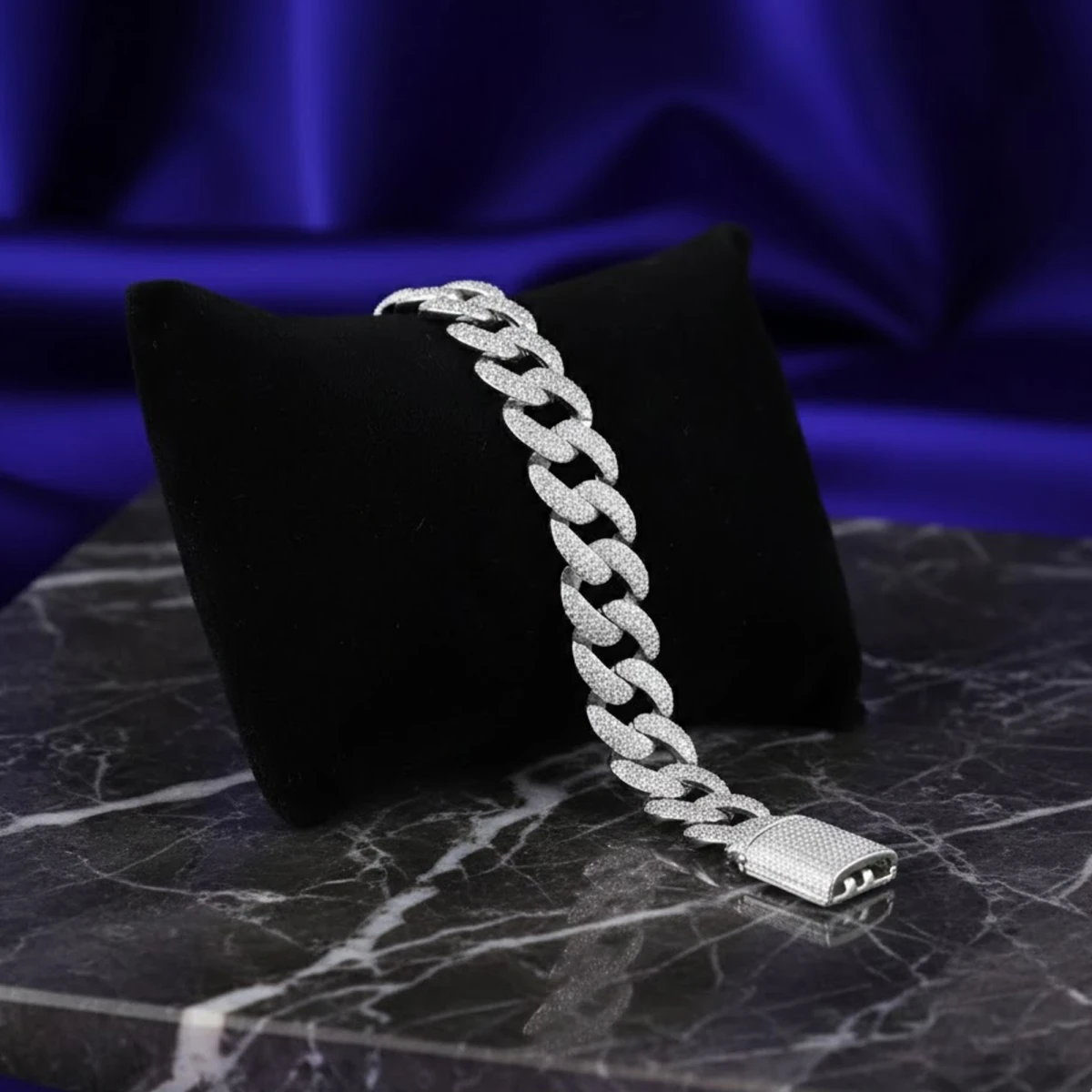 The Rajatavalaya bracelet features a bold curb-link chain design, fully encrusted with dazzling white stones that resemble fine cubic zirconia. Its chunky silver build exudes a luxurious, high-end appeal, making it the perfect statement piece for glamorous occasions.