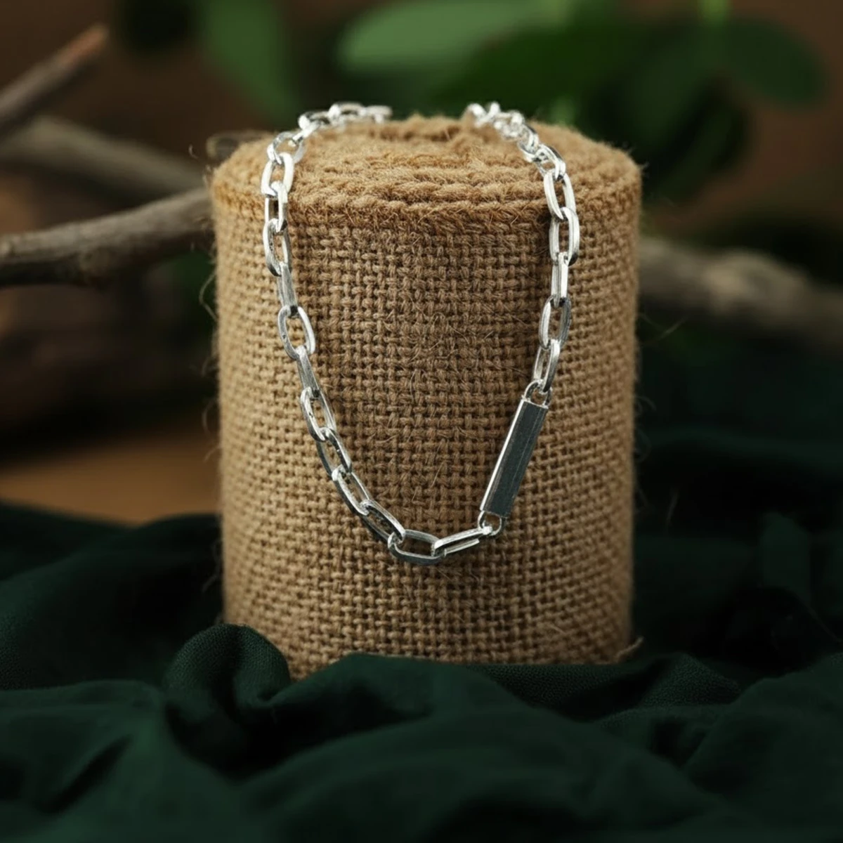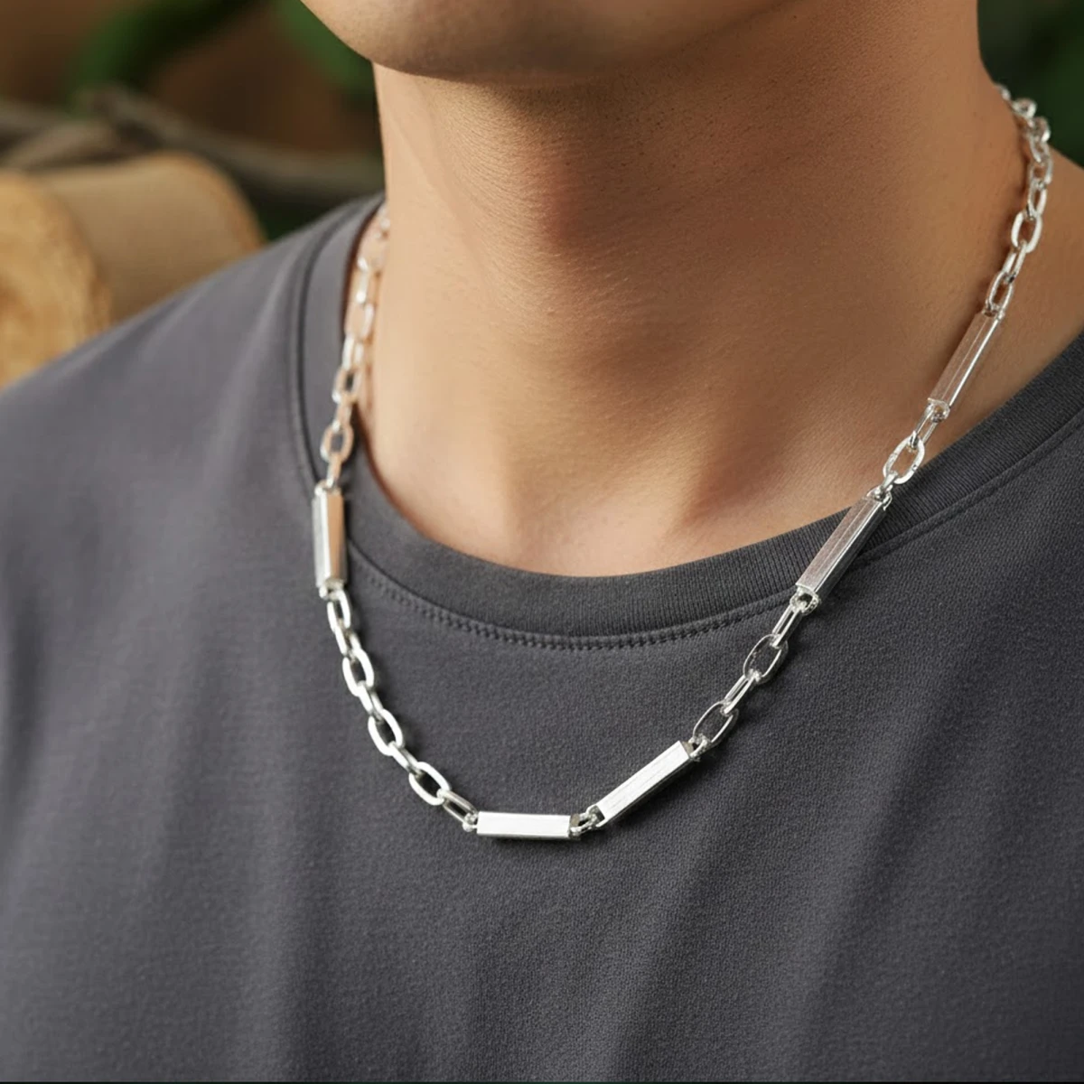 The Saumyā necklace features a sleek silver chain with a secure clasp for a smooth, polished finish. Its minimalist design makes it a versatile accessory—perfect to wear solo as a statement piece or layered with other chains for a contemporary look.