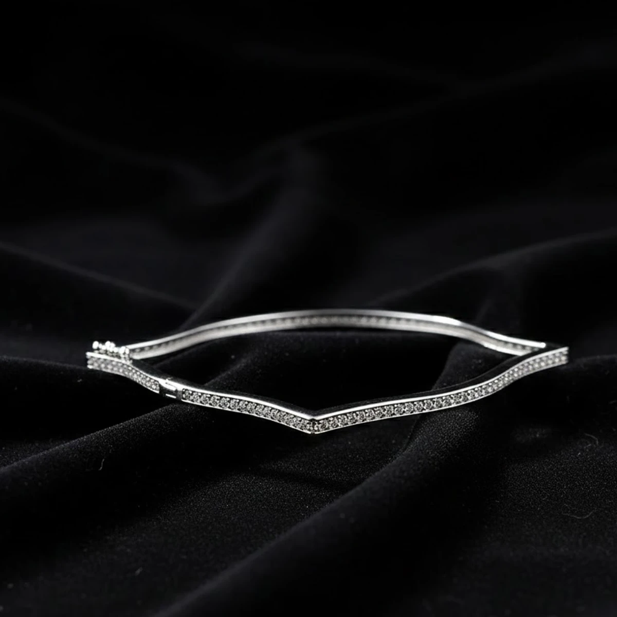 The Śubhravalaya bracelet showcases a refined silver design with a flexible snake chain-style band. Its textured and polished finish offers a subtle yet captivating shine, making it both comfortable and stylish. Perfect for adding a touch of understated elegance to any ensemble.