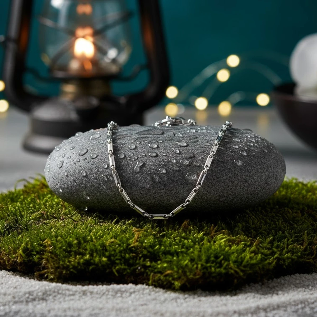 The Anurādhā chain showcases a refined silver design with alternating long and short rectangular links, creating a sleek, contemporary aesthetic. Its polished finish adds a touch of sophistication, making it perfect for both everyday wear and special occasions.