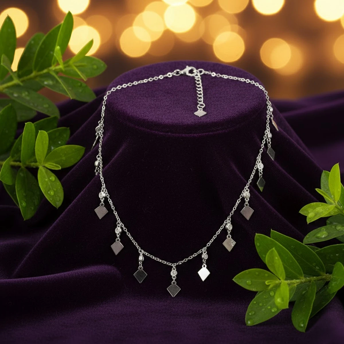 The Mañjarī chain features delicately polished rhombus-shaped charms arranged with perfect spacing for a graceful, playful movement. Its light and elegant design makes it ideal for adding a subtle sparkle to everyday looks or enhancing special occasions with refined charm.