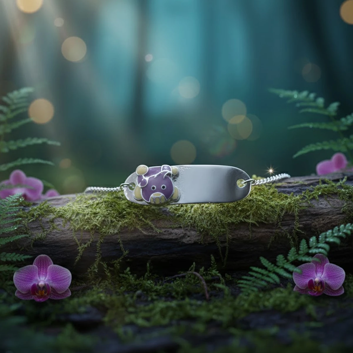 The Rājata-Valaya bracelet is an adorable silver accessory designed for children. It features a charming purple and yellow elephant with a tiny crown alongside a smooth oval ID plate. Connected by a delicate chain, it combines cuteness, comfort, and a touch of royal flair.