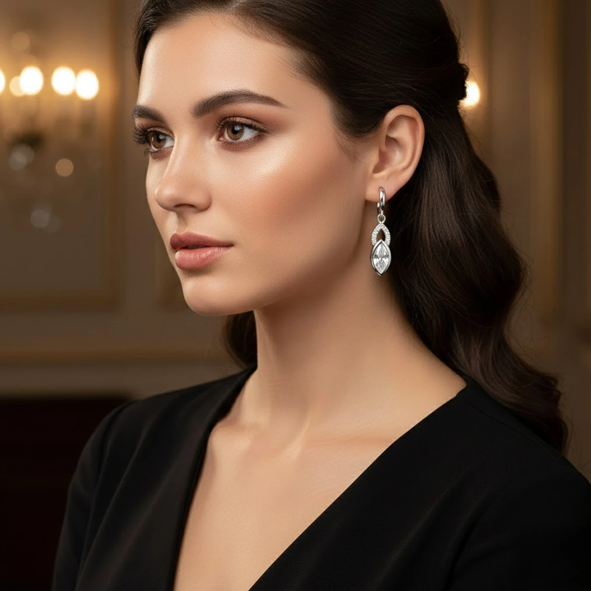 The Śrīkuṇḍala earrings are crafted from polished silver, featuring an elegant leaf-inspired design that exudes natural charm. A sparkling marquise-cut clear stone delicately dangles below, adding brilliance and movement. Perfect for enhancing both everyday elegance and special occasion looks.